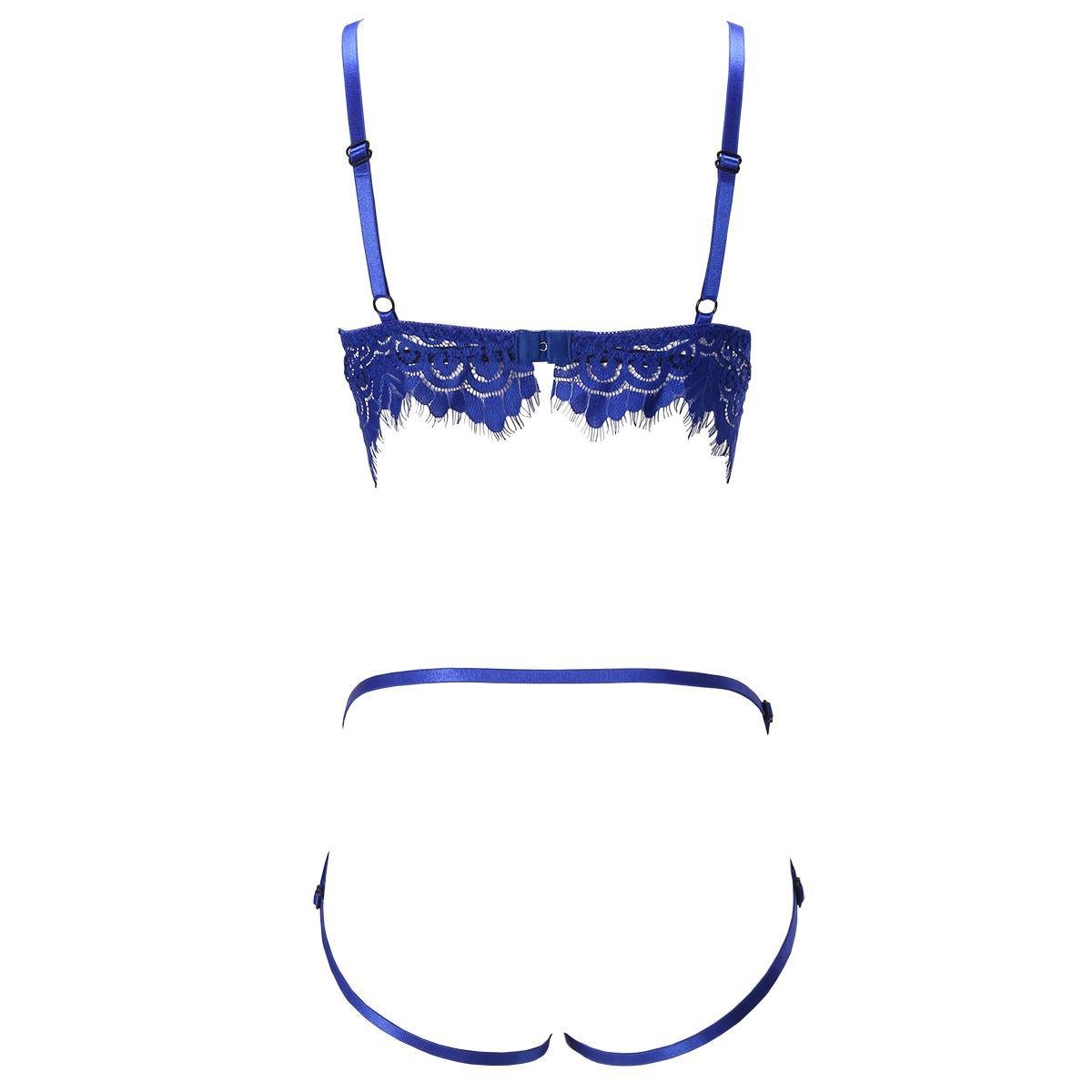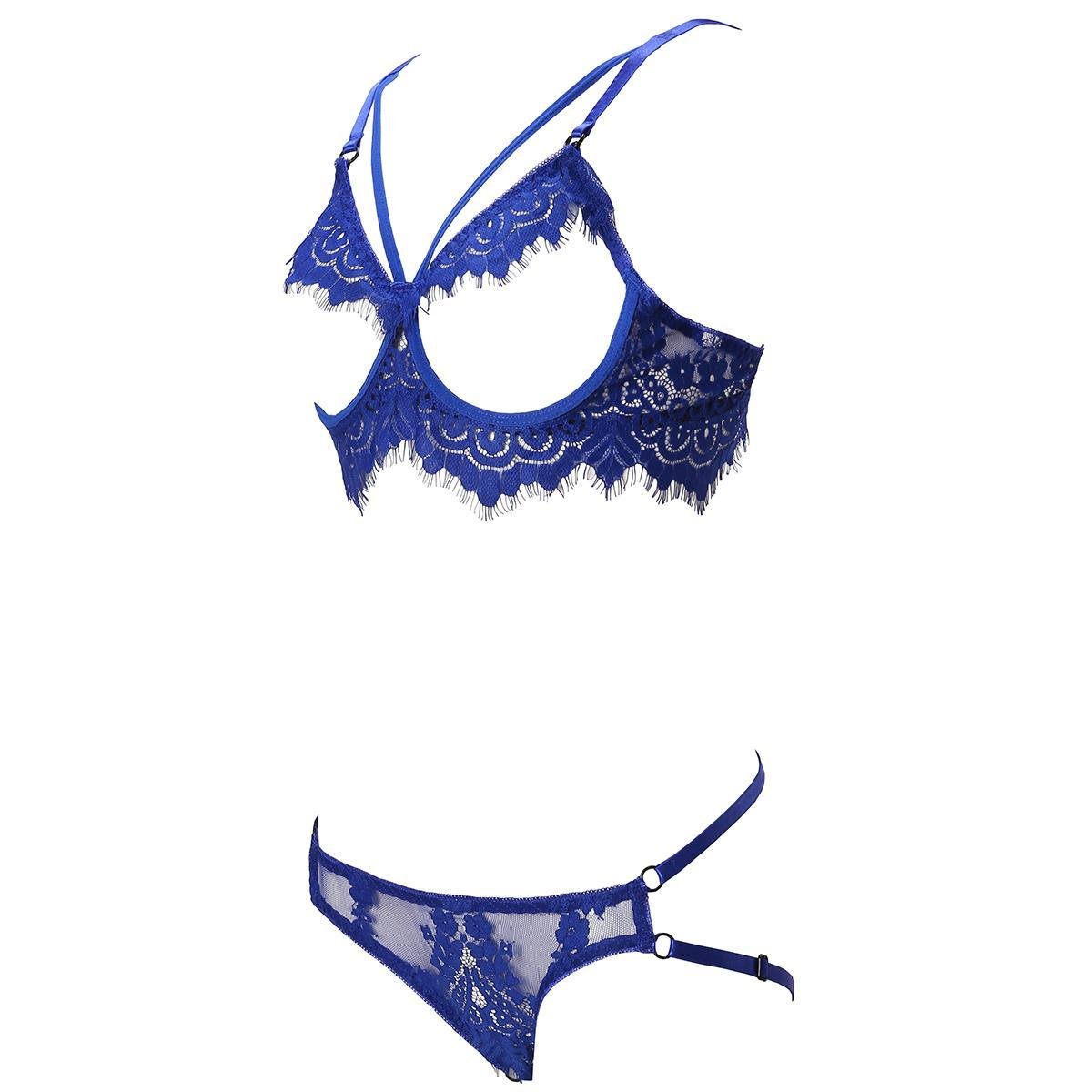 3.Lace Lingerie Bra and Thong Panty Set: This boldly sexy lingerie set features an open-cup bra with a eyslash dainty lace trim; Lace open-cup bra and thong set to show off your breasts and butt; open-crotch thong with open back leaves your butt bare; Hook and eye back closure helps stop the whole lingerie moving around.